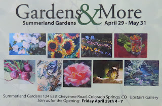 We thought it would be fun to have a show using this event as a jumping off point. "Gardens & More" show cases art work from some of the artists who painted that weekend. Paintings of any thing garden related, not just from those gardens, are hanging in the gallery. Hope those of you who live in the Colorado Springs area can stop by Summerland Gardens Upstairs Gallery for the Opening, Friday, April 29th 4 - 7 pm. Or, visit the gallery any time during the month of May.